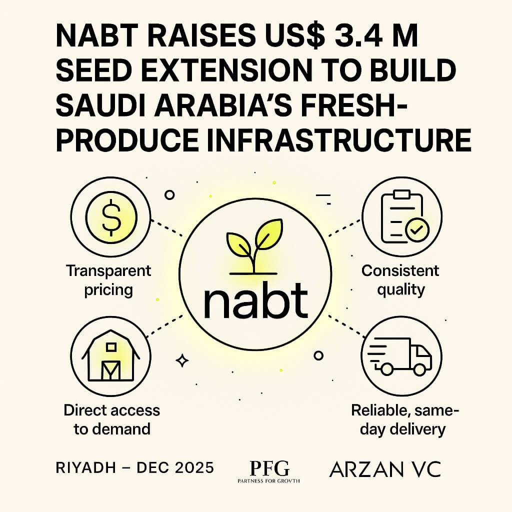 Nabt has raised US$ 3.4 million in a Seed extension round, strengthening its mission to build a more transparent, efficient, and technology-enabled fresh-produce ecosystem in Saudi Arabia.